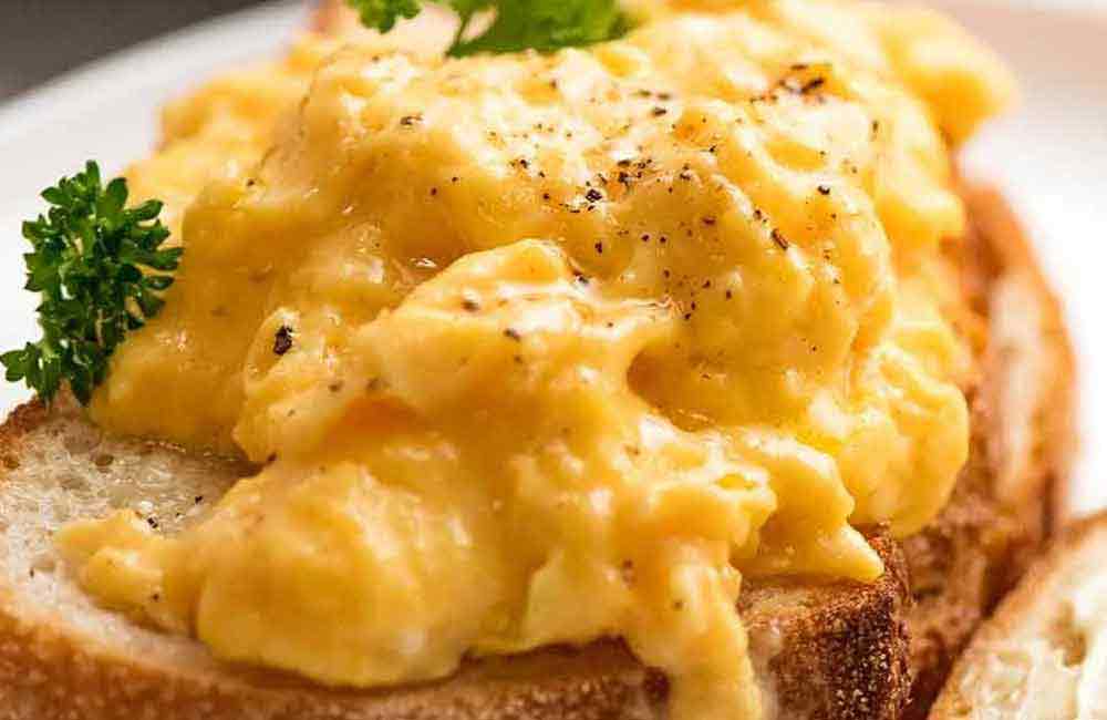 No one should tell you how to take your eggs. But everyone should know how to make scrambled eggs well! 60 seconds, soft, creamy, custardy. Perfection! Serve on homemade crusty Artisan bread for the ultimate eggs on toast – now officially the world’s easiest yeast bread.